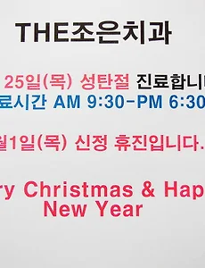 전체 글92 2015년 10월 3일, 10월 9일 정상 진료합니다. 안녕하세요. 웅원장입니다. 또...늦게 알려드리네요. 2015년 10월 3일 개천절(벌써 지났군요...TT) 10월 9일 한글날 THE조은 치과 정상 진료합니다. 평소에 시간이 없으시고, 바쁘셨던 분들이 이용하시면 좋으실 것 같습니다. 그럼, 한글날에 뵙겠습니다. 2015. 10. 5. 8월 14일, 8월 15일 정상진료 합니다~^^* 안녕하세요. 웅원장입니다. 오늘 8월 14일, 그리고 내일 8월 15일 THE조은 치과 정상진료 합니다. 늦게 알려드려 죄송합니다. 월요일부터 공지한다는게 이제서야 올리게 되었네요. 요즘 제가 굉장히 게을러 졌음을 느낍니다. 가을되면...부지런해져야 겠습니다. 그럼, 오늘 그리고 내일 뵙겠습니다. 2015. 8. 14. 2015년 6월 1일 부터 주차제도가 변경됩니다. 안녕하세요. THE조은 치과 웅원장입니다. 최근에 저희 치과에 와 보신 분들은 주차장입구가 달라졌다는 것을 아실 것입니다. 예전에는 주차관리를 해주시는 분이 계셨고, 요금도 받아주시고 하셨지만, 2015년 6월 1일부터 무인 주차 관리 시스템 으로 바뀌게 됩니다. 즉, 주차요금을 기계가 처리한다는 것이지요. 이번에 무인 주차 관리 시스템으로 전환이 되면서, 주차요금도 변경이 되게 되었습니다. 기존에는 치과진료를 받으시는 분들은 몇시간을 계시든 무료주차가 될 수 있도록 저희가 주차권을 챙겨 드렸지만, 이제부터는 2시간까지만 무료주차가 가능합니다. 따라서, 부득이하게 2시간 이상 주차가 필요하신 환자분들은 해동월드타워가 아닌 맞은편 건물 드림월드타워(카페베네건물)에 주차를 하셔야 무료주차혜택을 받으실 수 있.. 2015. 5. 31. 2015년 5월 공휴일 진료 안내입니다. 안녕하세요. THE조은 치과 웅원장입니다. 제가 요즘 바쁘다는 핑계로 블로그 관리를 소홀히 했네요. 그래도, 하루에 70분 정도씩 방문해 주시고 감사드립니다. ^^* 어느덧 2015년도 5월이 되었는데요. 5월에는 쉬는 날이 많네요. 그럼, THE조은 치과는 5월 공휴일 진료를 몇시부터 몇시까지 하는 지 알려드리겠습니다. 오늘이 벌써 5월 9일이니 제가 너무 늦게 알려드리는 거네요. 5월 25일 석가탄신일에 진료가 있는 것 참고하시구요. 일요일은 치과진료가 없는 점도 기억해 주시기 바랍니다. 그럼 즐주말 되세요~~ 2015. 5. 9. 2015년 음력 설날 연휴 진료일정입니다. 안녕하세요. THE조은치과 웅원장입니다. 2015년 음력 설날 연휴 진료 일정입니다. 원래는 설날이 오기 전에 글을 써야 하는데... 제가 깜박하고 연휴를 보내다가 이제서야 올리게 되었네요. 지금 저는 출근해서 진료중입니다. 오늘 2월 21일 토요일은 정상진료를 하고 있습니다. 설날 연휴는 잘 보내셨는지요? 토,일요일까지 쉬시는 분들이 많아 아직 연휴 중이라고 봐야 할지도 모르겠네요. 암튼, 새해 복 많이 받으시고, 원하시는 모든 일들이 다 이루어지는 한해가 되시길 바랍니다. 그리고, 무엇보다 살기 좋은 대한민국이 되는 한해가 되었음 합니다.^^ 2015. 2. 21. 크리스마스 때 진료합니다. 안녕하세요. 웅원장입니다. 이번주 목요일은 크리스마스 입니다. 거의 대부분의 직장인들이 쉬는 크리스마스 이긴 하지만, THE조은 치과는 정상진료합니다. 진료시간은 야간진료 없이 오전9:30 - 오후6:30 입니다. 평소 바쁘셔서 내원하실 수 없으신 분들의 많은 방문을 기대해 봅니다. ^^* 아...그리고 2015년 1월 1일은 진료 휴무입니다. 1월 1일은 가족과 함께 보내볼 예정입니다. 그럼, 즐겁고 행복한 연말연시 되시길 바랍니다. 2014. 12. 22. 이전 1 2 3 4 5 6 ··· 16 다음